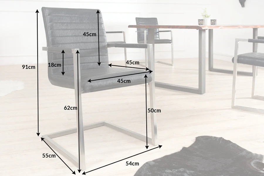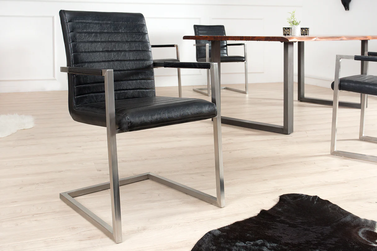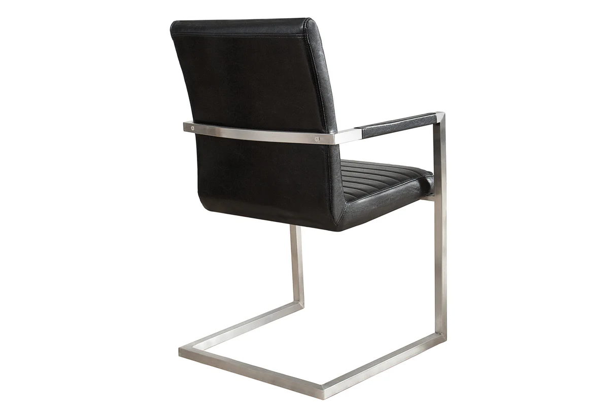 Toto moderné kreslo v štýle cantilever kombinuje elegantný vzhľad a praktickosť. Čierna syntetická koža v čiernom odtieni pôsobí nadčasovo a ľahko ladí s rôznymi štýlmi interiérov. Vďaka rámu bez zadných nôh je stolička vizuálne ľahká a elegantná, zatiaľ čo podrúčky poskytujú dodatočný komfort pri sedení. Ideálne pre jedálenské priestory, pracovné kútiky alebo do miestností, kde chceš mať dizajnový kus nábytku bez toho, aby prekážal.