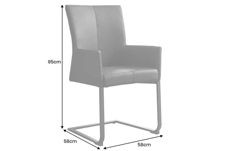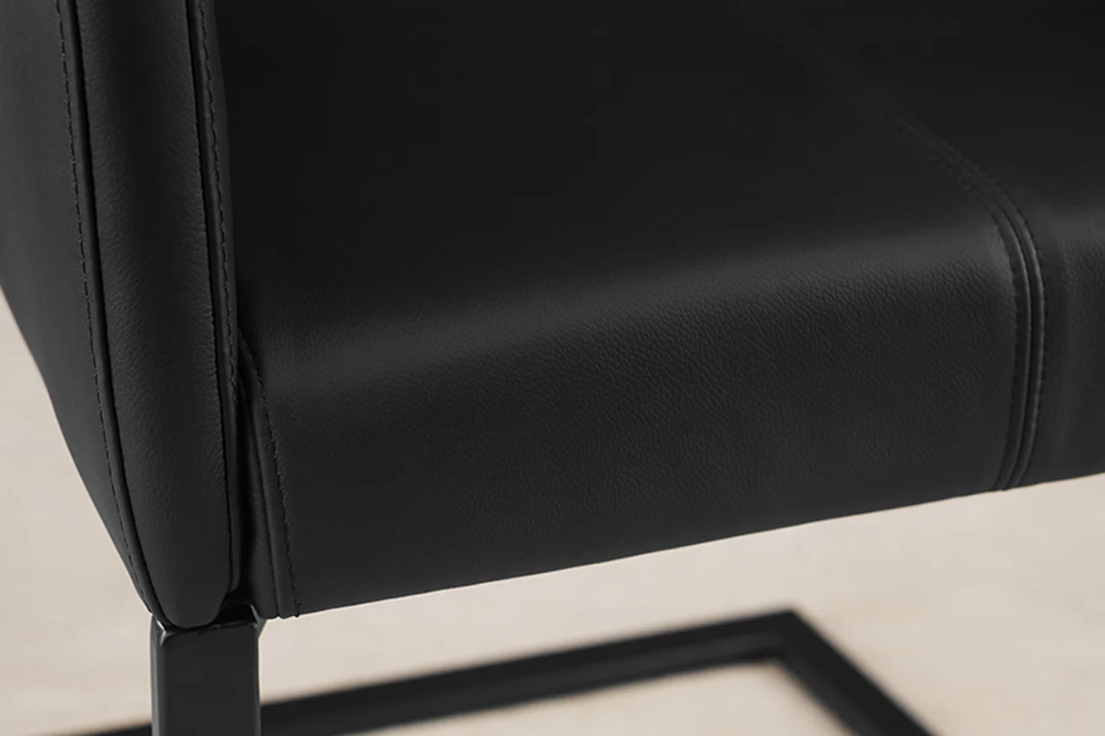 Sedacia časť je potiahnutá pravou kožou v čiernej farbe, ktorá pôsobí luxusne, profesionálne a zároveň je veľmi praktická. Koža sa jednoducho udržiava a je odolná voči opotrebeniu, čo z nej robí skvelú voľbu pre každodenné využívanie. Pevné čierne kovové nohy v cantilever štýle dodávajú stoličke nielen moderný vzhľad, ale aj pružnosť a stabilitu. Pri sedení poskytuje jemný kývavý efekt, ktorý zvyšuje komfort najmä pri dlhšom sedení.