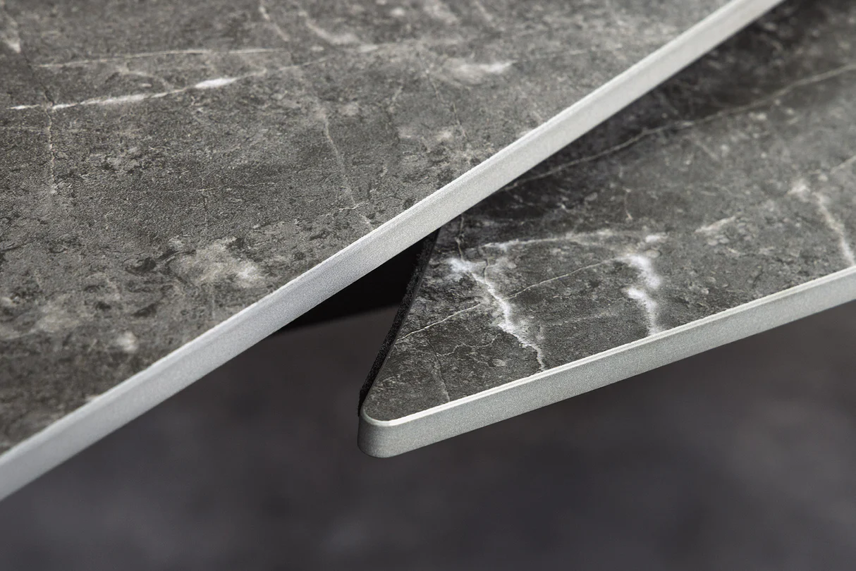 Zažiar v interiéri s eleganciou moderného dizajnu: stôl INCEPTION 130–190 cm ponúka nádherný antracitový keramický povrch s mramorovým efektom, zakomponovaný do robustného čierneho kovového rámu. Vďaka premyslenému rozkladaciemu mechanizmu je jeho dĺžku možné flexibilne upraviť z 130 cm až na 190 cm — ideálne pre každodenné aj slávnostné stolovanie. Hrúbka keramického vrchu je 10 mm, nosnosť možno dosahuje až 60 kg, čo zaručuje stabilitu aj dlhodobú spoľahlivosť.