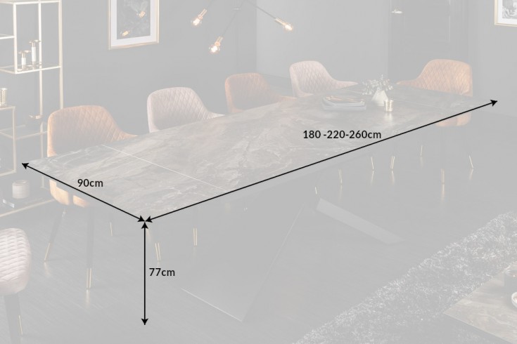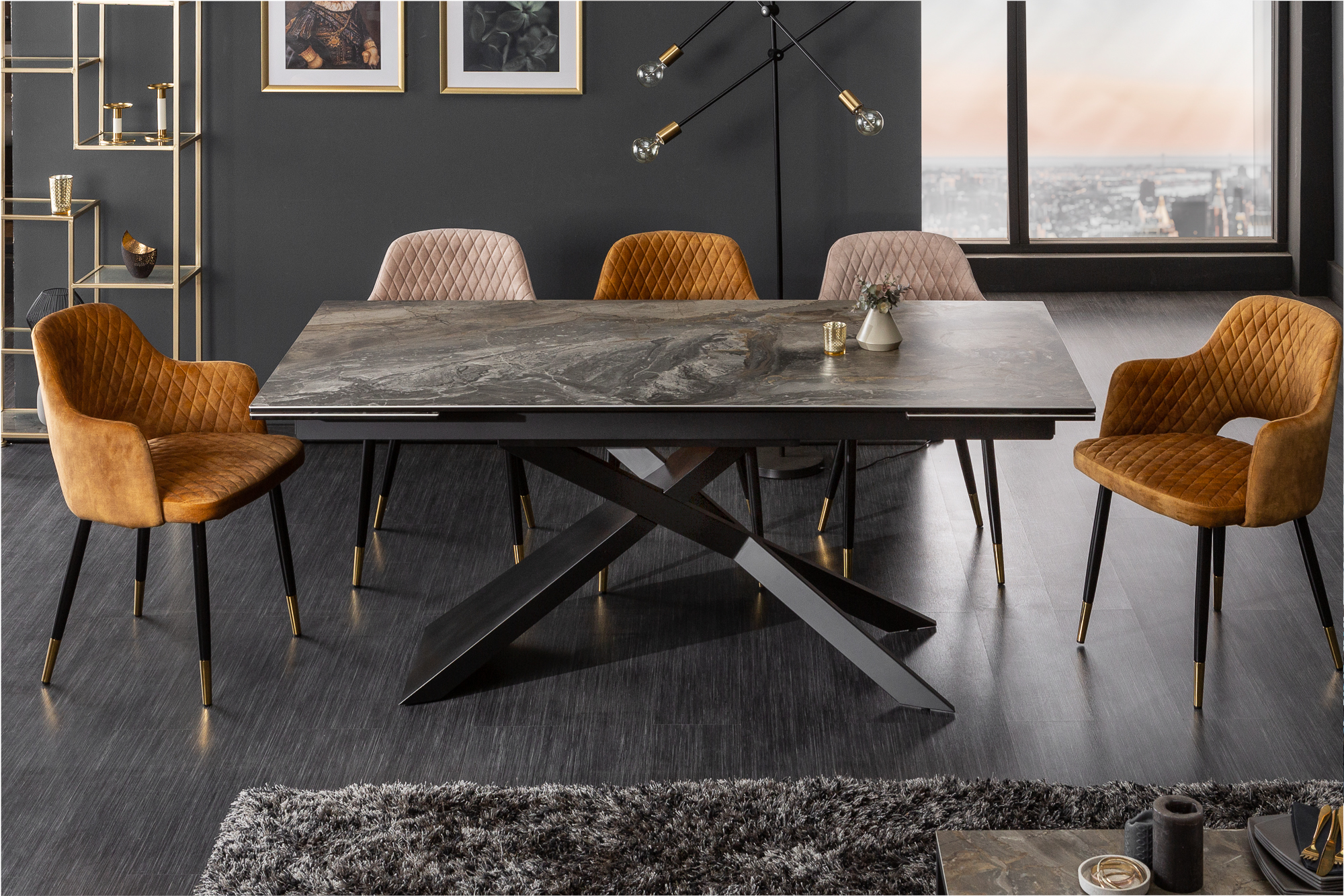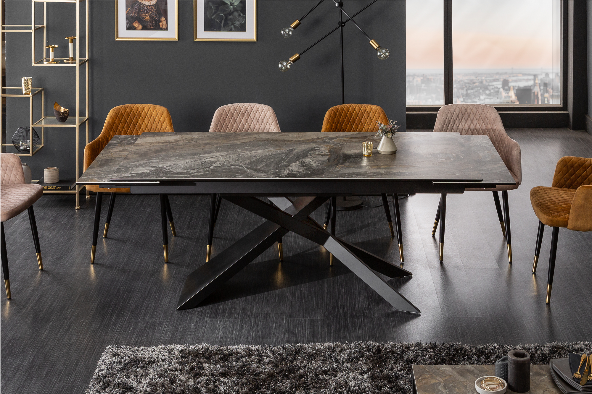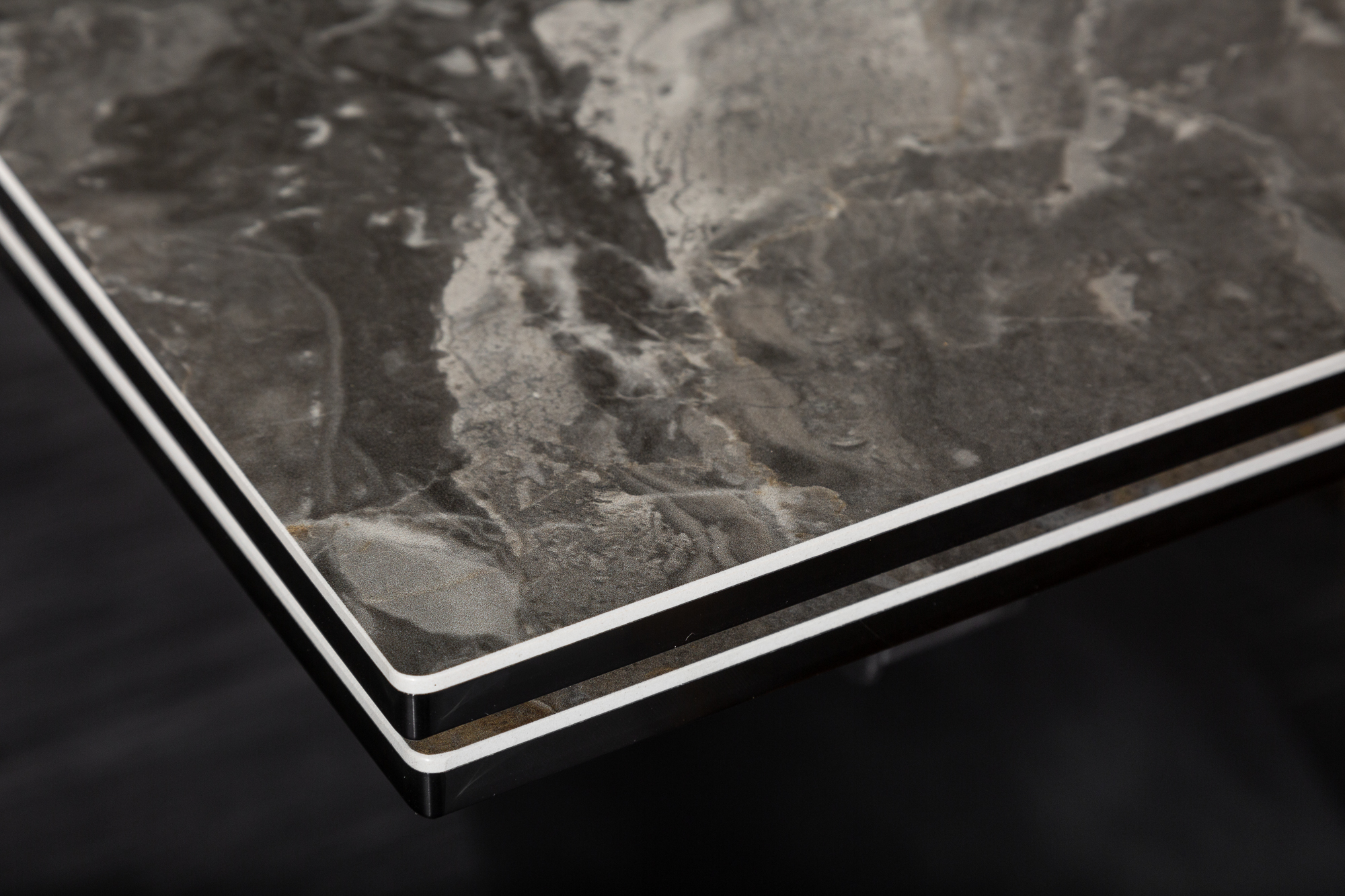 Ak máte záľubu v nekonvenčných veciach, mali by ste sa teraz zblízka pozrieť na náš jedálenský stôl EUPHORIA. Jeho veľká stolová doska je vyrobená z vysoko kvalitnej talianskej keramiky s mramorovým vzhľadom. Povrch stolovej dosky je jemne zdrsnený, aby sa dosiahol elegantný vzhľad a dojem. Impozantné skrížené nohy stola v robustnom štýle tvoria zručný kontrast k takmer filigránsky vyzerajúcej keramickej doske. Ak chcete pridať eleganciu a štýl do vášho domova, EUPHORIA je pre vás ideálny výber. Nechajte sa uniesť túžbou po exkluzivite a vkuse.