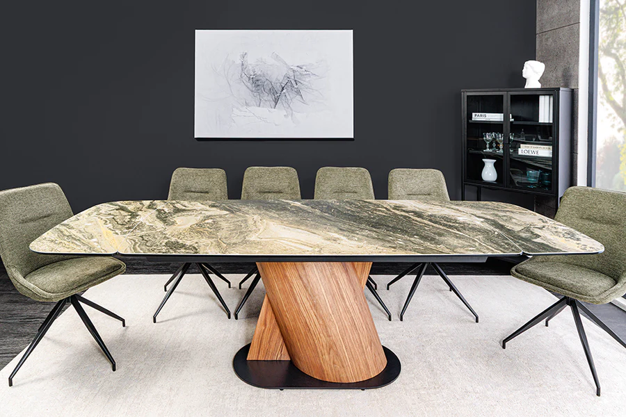 Stôl ELEMENTS predstavuje dokonalú kombináciu moderného dizajnu a funkčnosti. S rozmermi od 180 cm do 260 cm ponúka dostatok priestoru pre každodenné rodinné večere aj väčšie spoločenské udalosti. Jeho elegantný orechový rám v prírodnom odtieni dodáva interiéru teplý a príjemný vzhľad, zatiaľ čo keramická doska v odtieni taupe-beige s mramorovým vzhľadom prináša do priestoru nádych luxusu a sofistikovanosti.