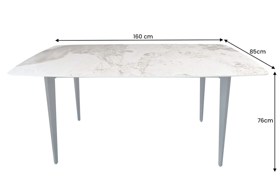 Stôl má šírku 160 cm, čo z neho robí ideálne riešenie pre 4 až 6 osôb – praktické pre každodenné stolovanie aj príležitostné posedenia. Keramická doska je nielen vizuálne príťažlivá, ale aj vysoko funkčná – odolná voči poškriabaniu, teplu a ľahko sa udržiava. Kovová podnož z práškovo lakovanej ocele zaručuje pevnosť a stabilitu aj pri vyššom zaťažení.