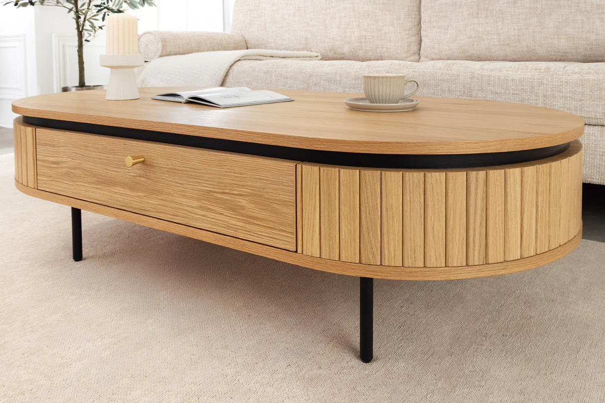 Konferenčný stolík Atelier 120 cm v dekóre prírodného dubového dreva s čiernymi kovovými nohami prináša do interiéru dokonalú rovnováhu medzi moderným dizajnom a prírodným vzhľadom. Jeho jednoduché línie, kombinácia teplého drevodekoru a kontrastného kovu pôsobia elegantne a univerzálne. Stolík sa vďaka svojmu čistému dizajnu hodí do moderných, industriálnych aj škandinávskych interiérov a vytvára útulnú, harmonickú atmosféru.