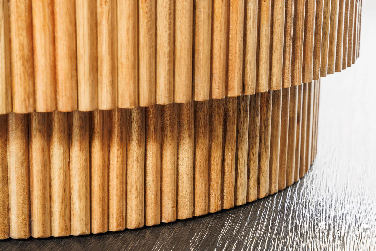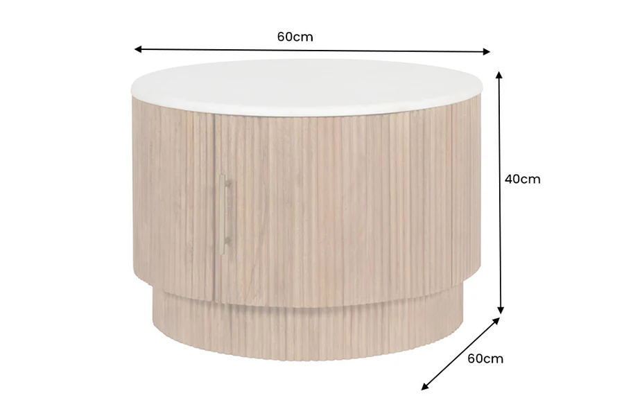 Konferenčný stolík Tres s priemerom 60 cm kombinuje prírodnú krásu mangového dreva s elegantným bielym mramorovým vrchom. Doska s hrúbkou 15 mm je vyrobená z keramického materiálu s mramorovým vzorom, pričom rám v prírodnej farbe mangového dreva poskytuje pevnosť a moderný vzhľad.