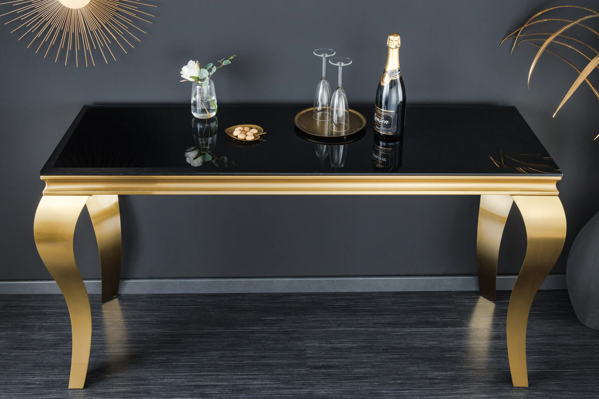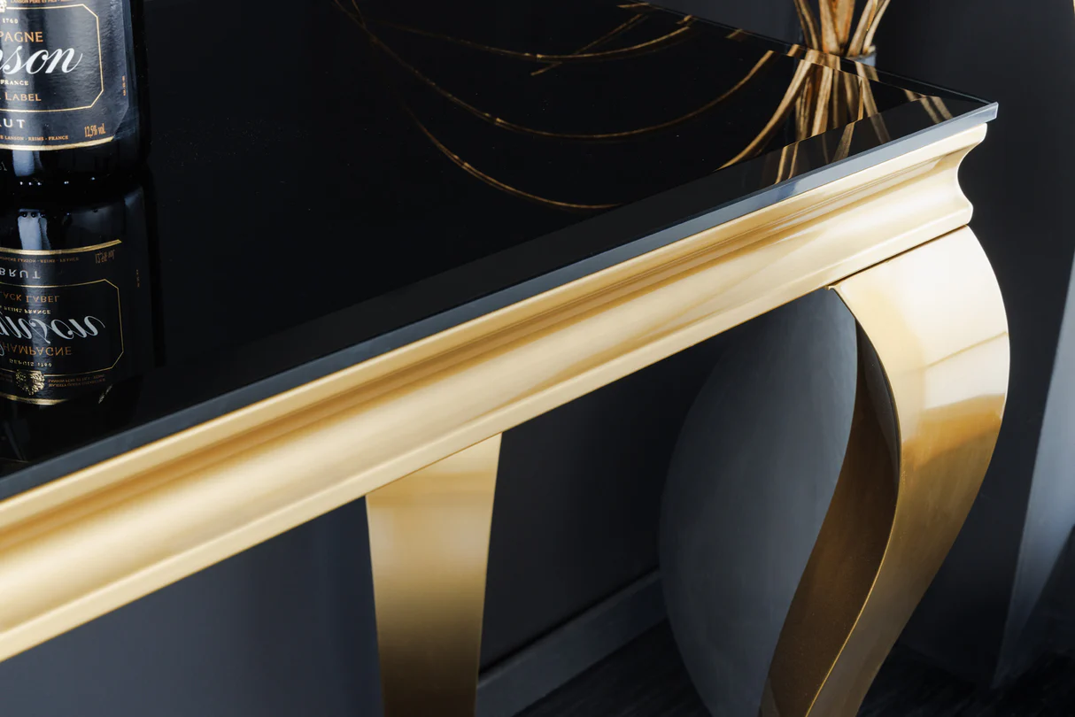 Zmyselná kombinácia odolné tvrdené opálové sklo v čiernom prevedení a hladkö zlaté línie oceľového rámu vytvára výrazný a luxusný akcent pre predsiene, obývačky alebo elegantné priestory. Typické barokové tvary nôh sú reinterpretované modernejšie, so zmyslom pre detail a nadčasovosť.