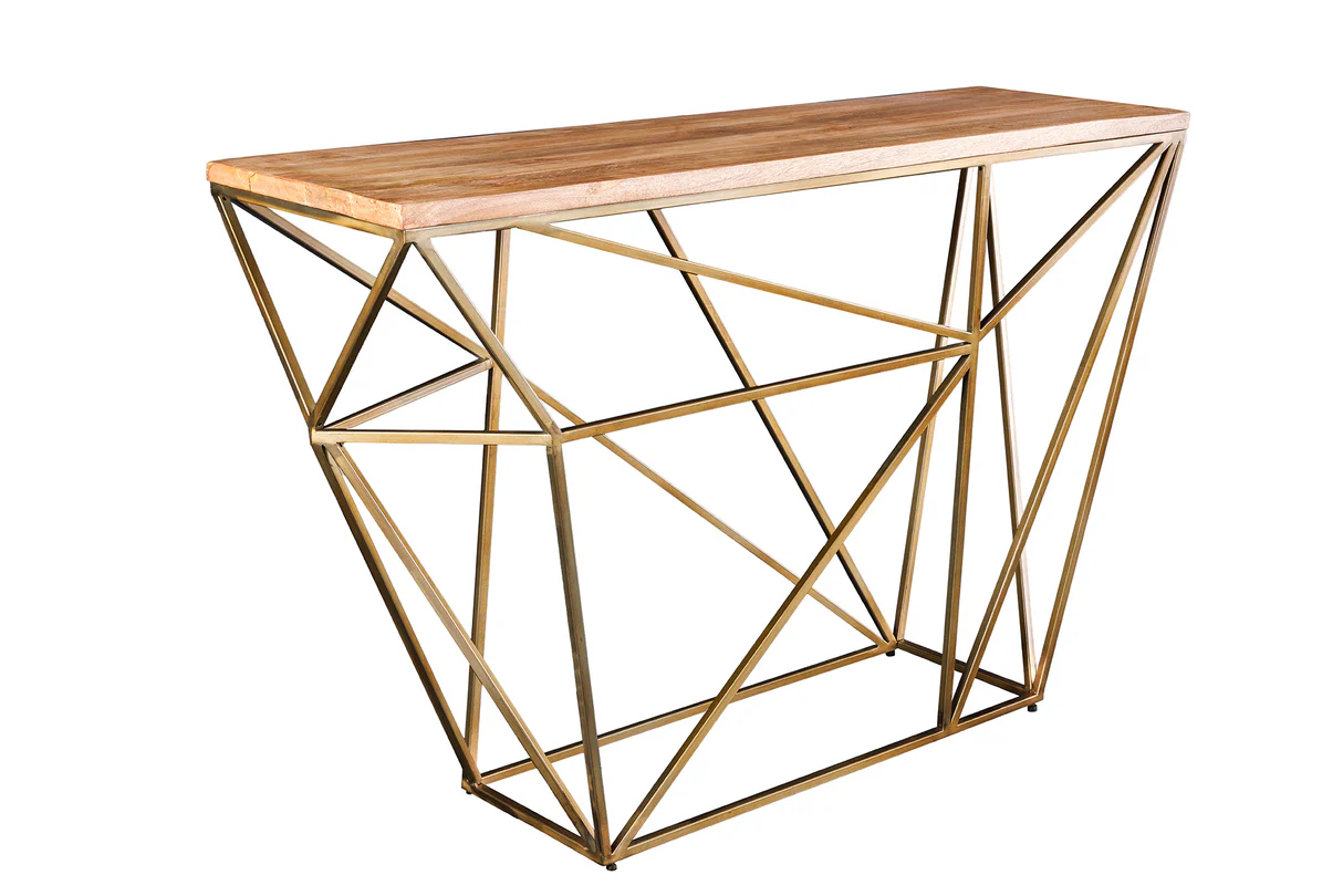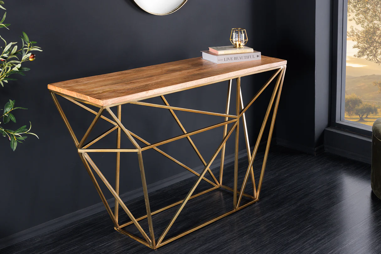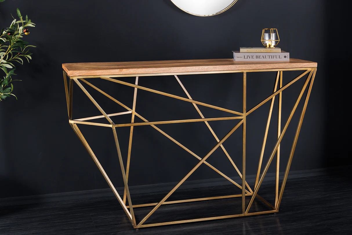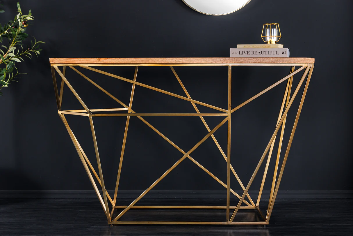 Konzola DIAMOND v industriálnom štýle predstavuje harmonické spojenie prírodného masívneho mango dreva a kovovej konštrukcie s mosadzným vzhľadom. Svojím elegantným, no zároveň robustným dizajnom je ideálnym doplnkom do modernej domácnosti. Využiješ ju ako štýlový konzolový stolík v predsieni, pod zrkadlo, alebo ako dizajnový prvok v obývačke či pracovni. Každý kus je originál vďaka prirodzenej štruktúre dreva a zaujme na prvý pohľad.