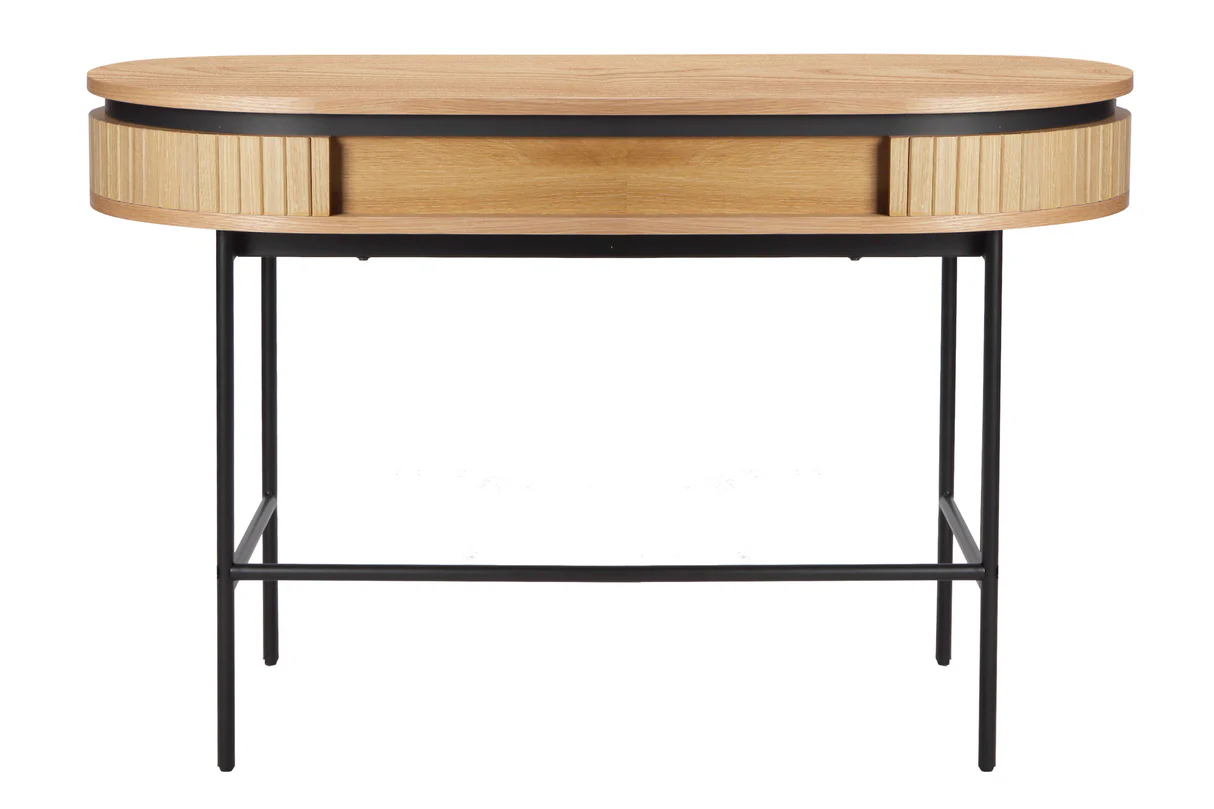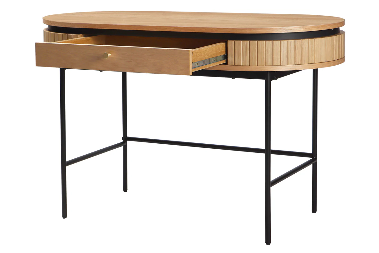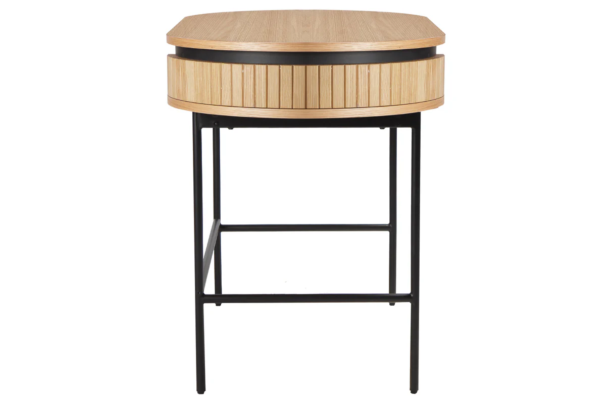 Tento stôl ATELIER so šírkou 120 cm spája elegantný vzhľad prírodného dubu s priemyselným šarmom čierneho kovu. Ideálny pre domáce kancelárie, študovne alebo pracovné kúty, kde potrebuješ dostatok pracovnej plochy bez toho, aby stôl zbytočne dominoval priestoru. Vrchná doska s dubovým dekorom poskytuje príjemný teplý odtieň, zatiaľ čo čierny rám dodáva moderný kontrast. Jeden zásuvkový priestor pomáha udržiavať poriadok v potrebách ako peračníky, dokumenty alebo drobnosti na pracovnom stole.
