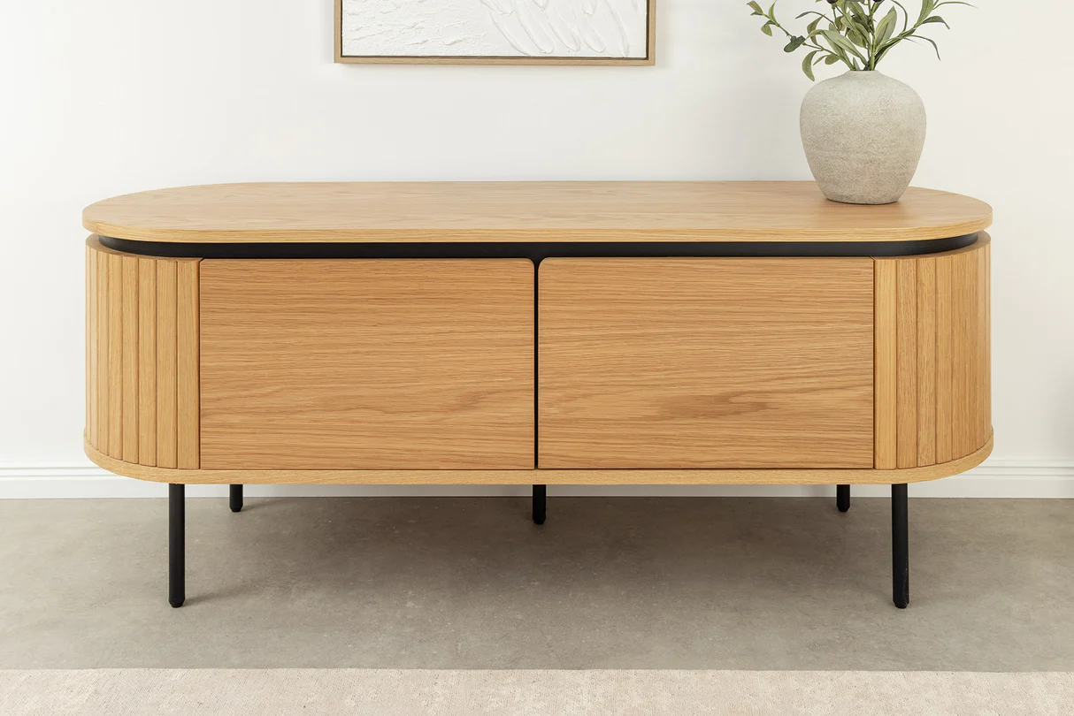 TV stolík Atelier 120 cm spája teplý prírodný odtieň dubového dreva s elegantnými čiernymi kovovými nohami. Vďaka kompaktným rozmerom je ideálny pre menšie aj stredne veľké obývacie priestory. Jeho jednoduchý, no výrazný dizajn s nádychom industriálneho štýlu pôsobí moderne, no zároveň nadčasovo. Stolík ponúka funkčnosť, kvalitu a estetický vzhľad v jednom.