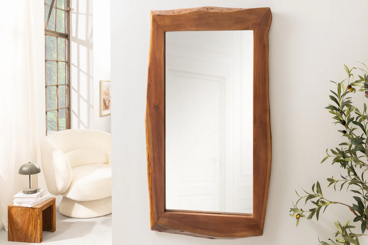 Zrkadlo MAMMUT 160 cm je pôsobivý dizajnový kúsok s výrazným rámom z masívneho akáciového dreva. Vďaka technike „natural edge“ má rám zachovaný prirodzený tvar dreva, čo každému kusu dodáva autentický vzhľad a jedinečný charakter. Hnedý lakovaný povrch zvýrazňuje textúru dreva a prináša do priestoru hrejivú, prirodzenú atmosféru. So svojou výškou 160 cm je ideálnym doplnkom pre vstupné haly, obývačky aj spálne, kde nielen skrášli interiér, ale aj opticky zväčší priestor.